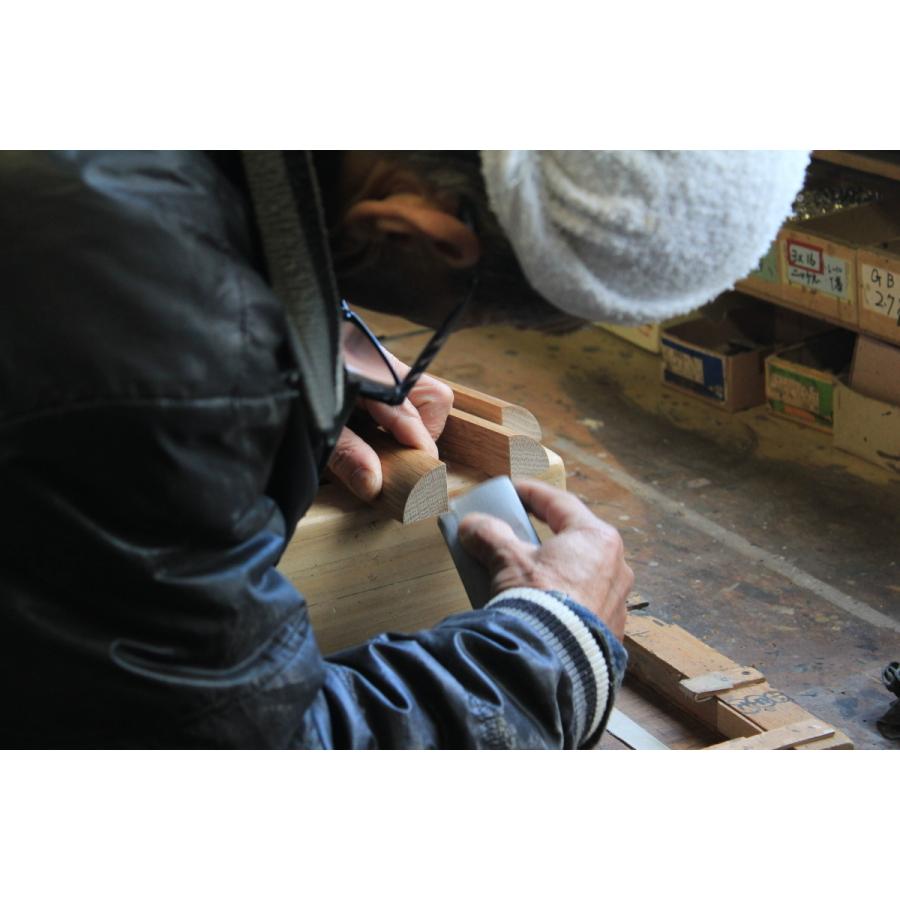カットされた材料は、そのままだと欠けてしまいやすいので、手作業で小さく角を落とします。削った面が大きすぎると、組み付けた時に目立ってしまいますので、必要最小限に抑えて削っていきます。