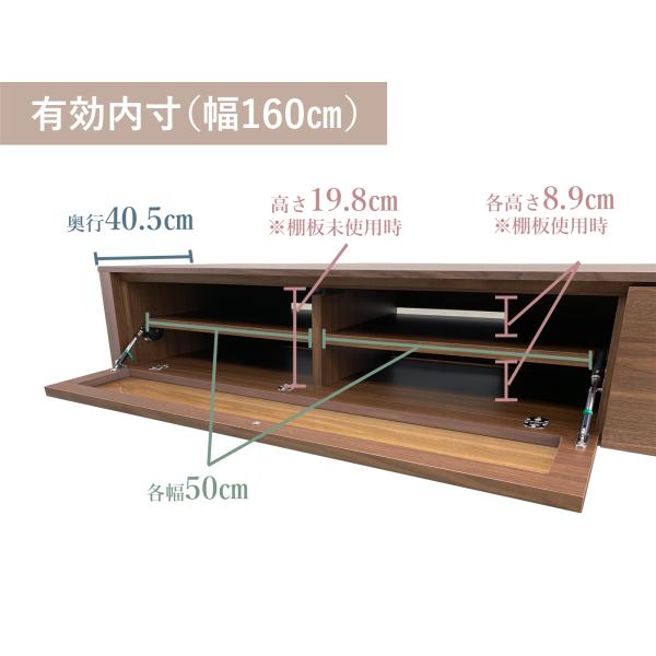 フラップ扉を開けるとAV機器の収納空間になっており、可動式の棚板が2枚付いています。